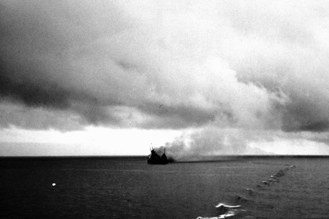 By 2:03, the ship was in flames and going down. The crew fled to the sea.