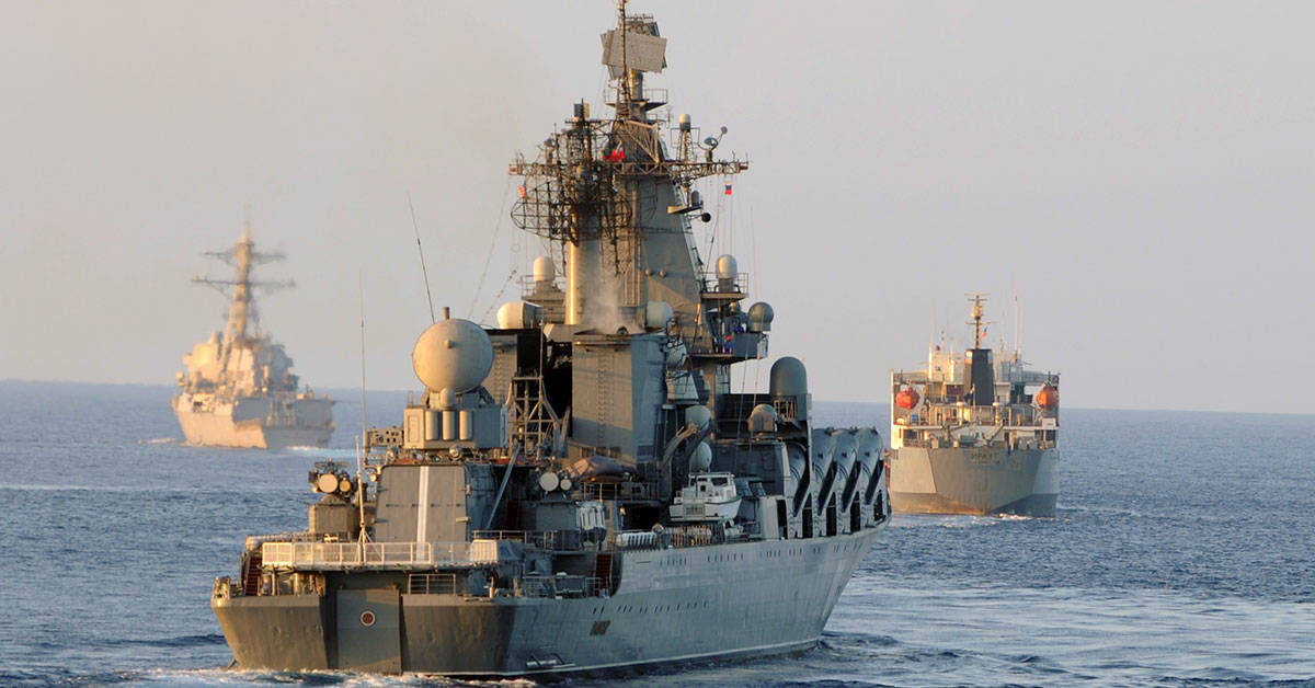The forward deployed Arleigh Burke-class guided-missile destroyer USS McCampbell (DDG 85), left, leads the Russian Federation navy Slava-class guided-missile cruiser Varyag and the Irkut tanker during Pacific Eagle, a bilateral exercise with the Russian Federation navy. (U.S. Navy photo by Mass Communication Specialist 3rd Class Corey Hensley)