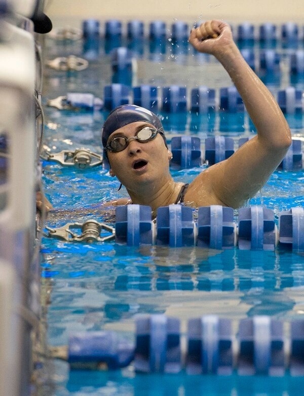 Hockenberry celebrates after winning gold in the 50 meter freestyle at the 2018 DoD Warrior Games.