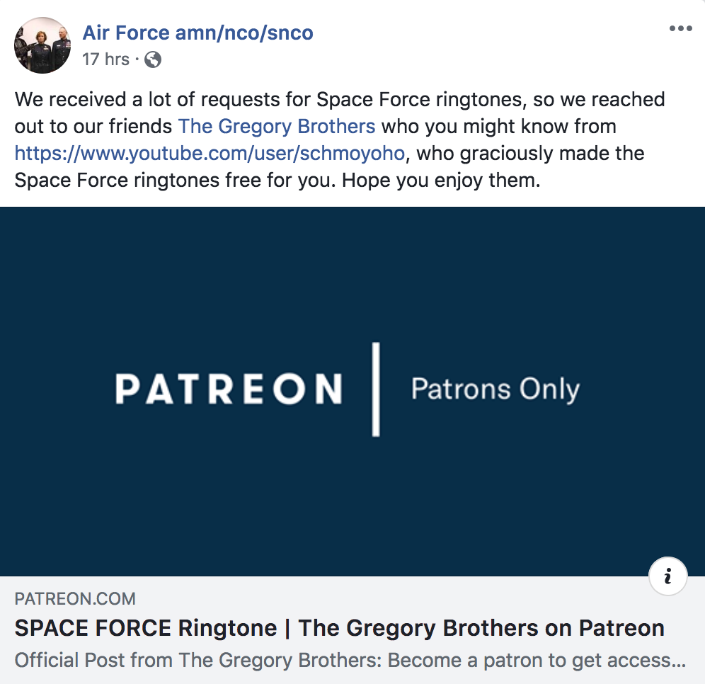 This songified version of President Trump’s Space Force announcement was created by The Gregory Brothers, whose YouTube page is packed with pop culture songification. Due to the popular demand for the song to be made into a ringtone via the popular Air Force Facebook page Air Force amn/nco/snco, the Gregory Brothers responded immediately.