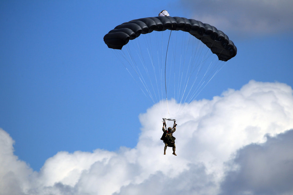 A California National Guard soldier from the 19th Special Forces Group descends for a landing during a high altitude, high opening training near Los Alamitos, California in February 2018.