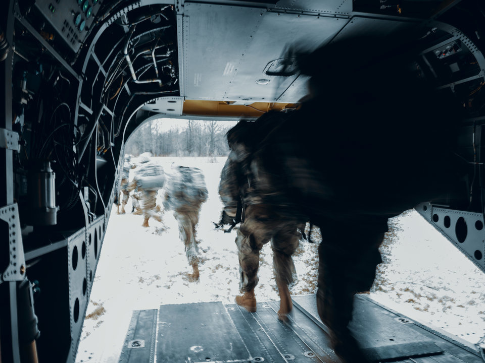 Soldiers assigned to the 101st Cavalry Regiment of the New York Army National Guard off load from a CH-47 Chinook during cold weather training in January 2019.