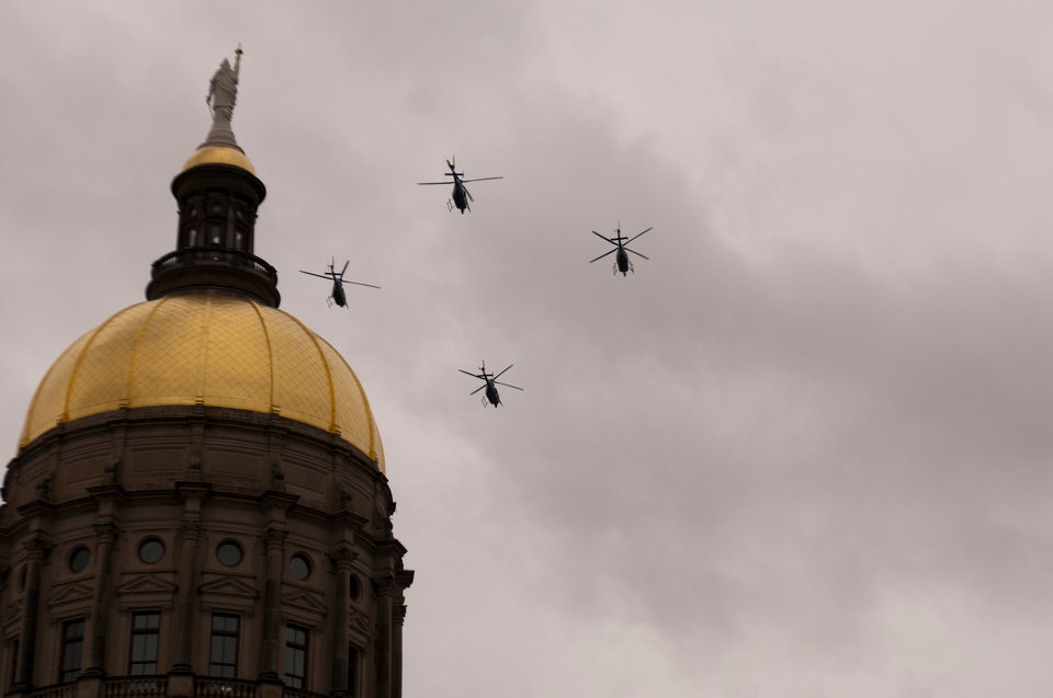 Georgia Army National Guard helicopters fly over the Georgia State Capitol during the inauguration of Governor Brian Kemp on Jan. 14, 2019.