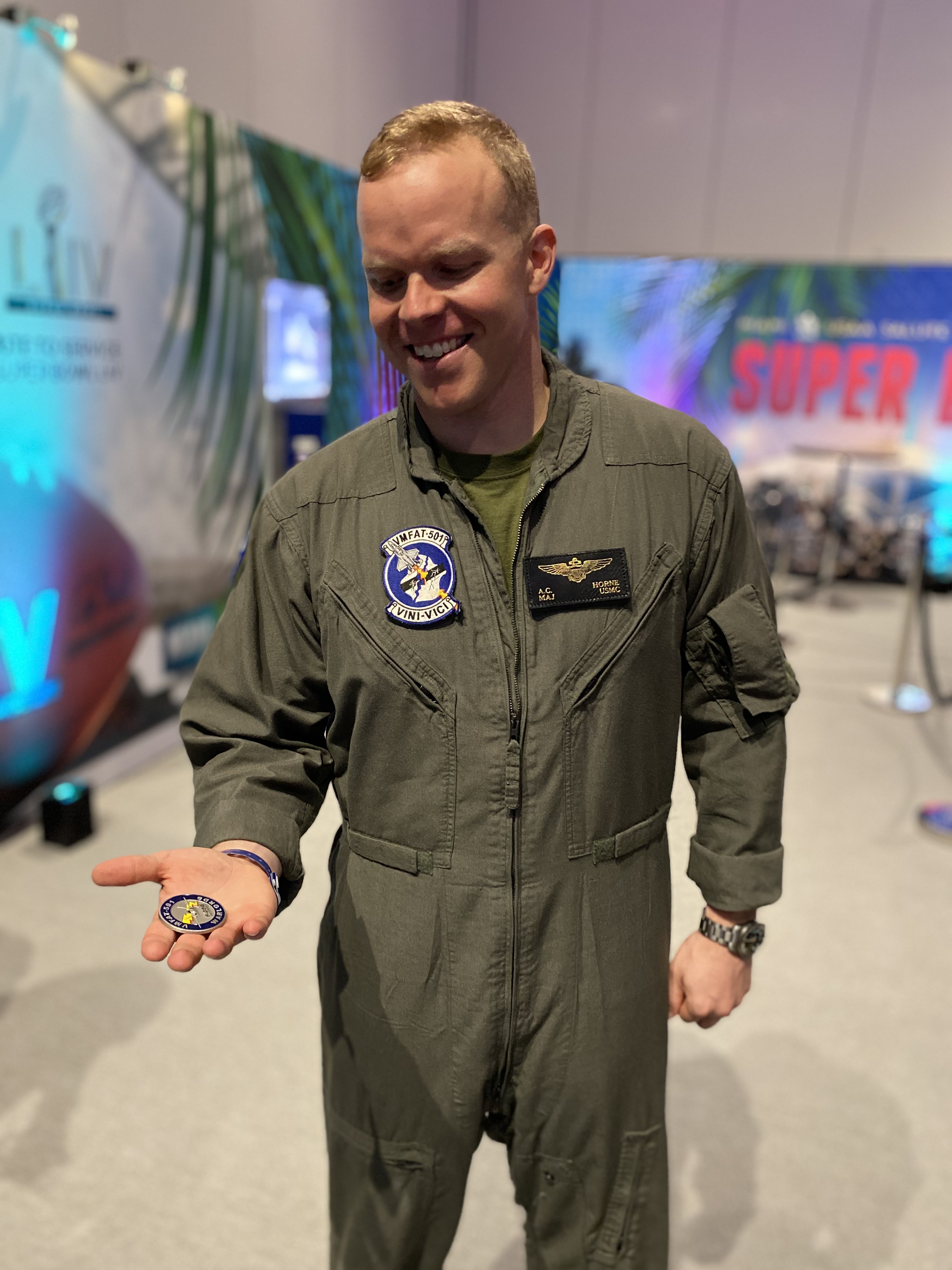 Major Alex Horne displays the challenge coin that decided who would get to fly in the Super Bowl LIV flyover.