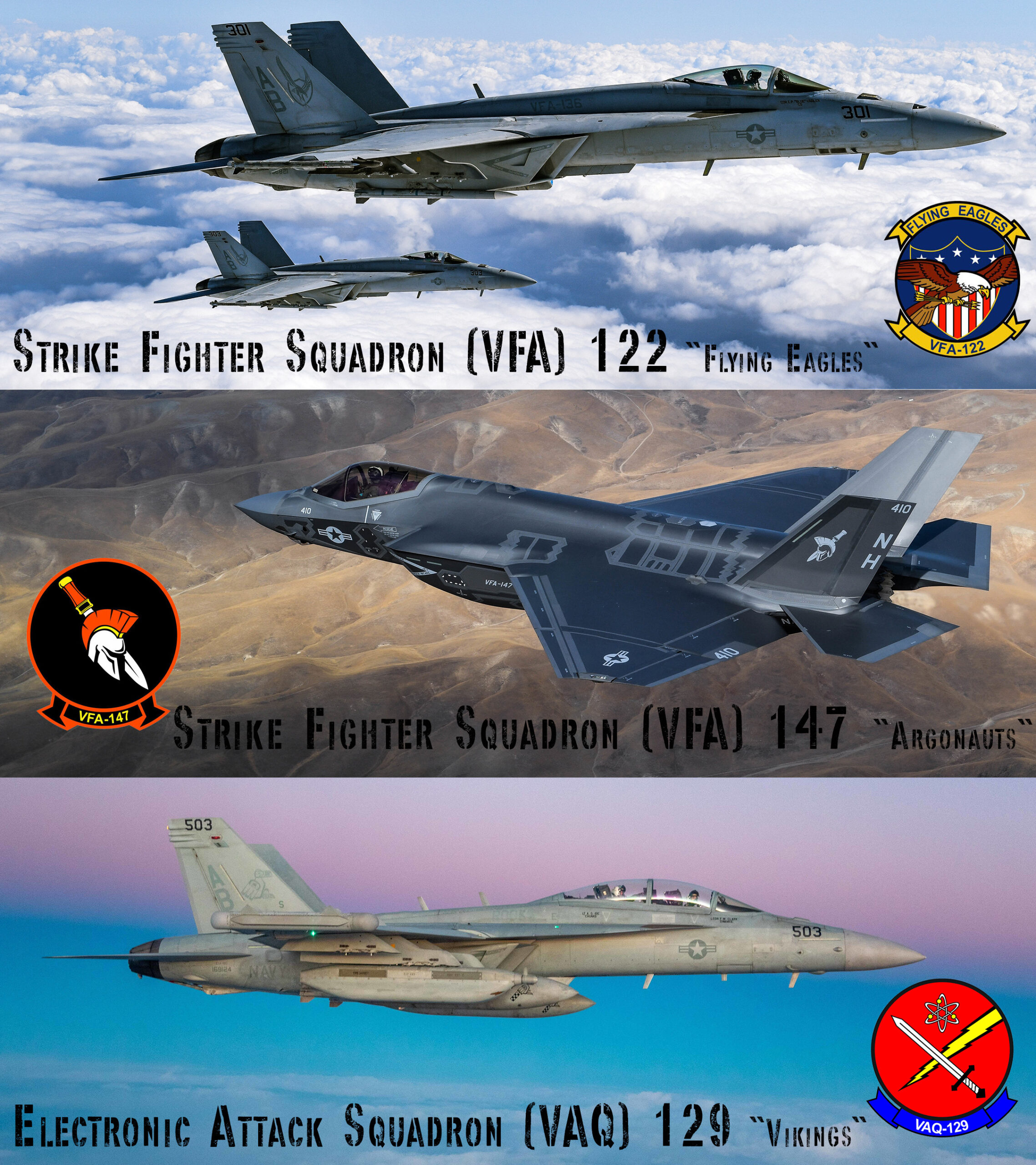 VFA-122 is contributing two F/A-18F Super Hornets to the formation. They will be joined by an F-35C Lightning II from the “Argonauts” of VFA-147 and an EA-18G Growler from the “Vikings” of Electronic Attack Squadron 129 (VAQ-129). The strike fighters are based out of NAS Lemoore, California while VAQ-129 is based out of NAS Whidbey Island, Washington. All aircraft will stage at and fly from Luke Air Force Base, Arizona for their historic flight over State Farm Stadium on Super Bowl Sunday.