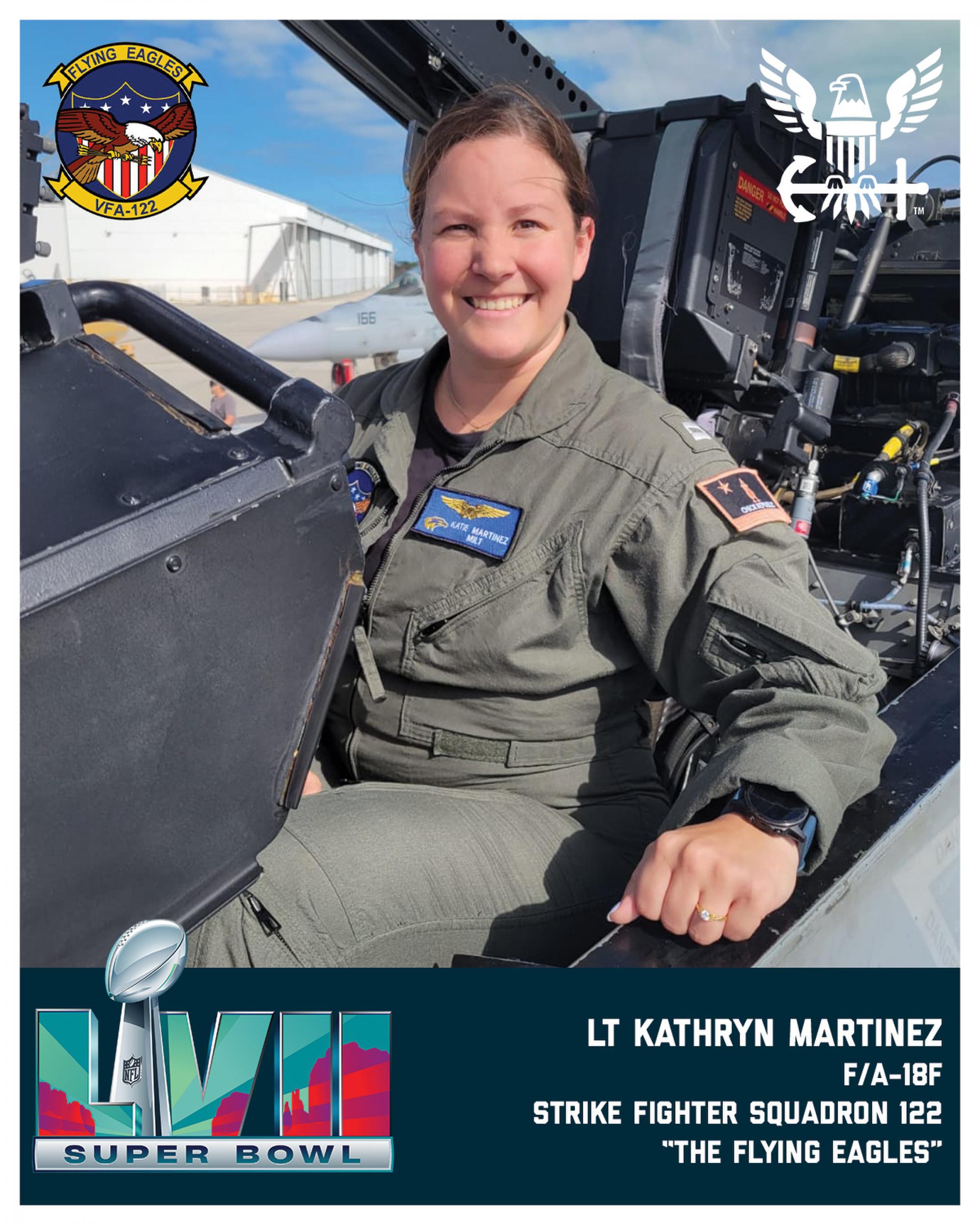 The Navy notes that this is the first time in history that the Super Bowl flyover team consists entirely of women. One of those women is Lt. Katie Martinez, a Naval Flight Officer assigned to the “Flying Eagles” of Strike Fighter Squadron 122 (VFA-122). “It’s not a feeling I can even put into words,” Martinez said in a Navy Public Affairs release. “It doesn’t get bigger than the Super Bowl, and I am humbled and honored to be able to participate with my friends and fellow Naval Aviators as part of this once-in-a-lifetime opportunity.”