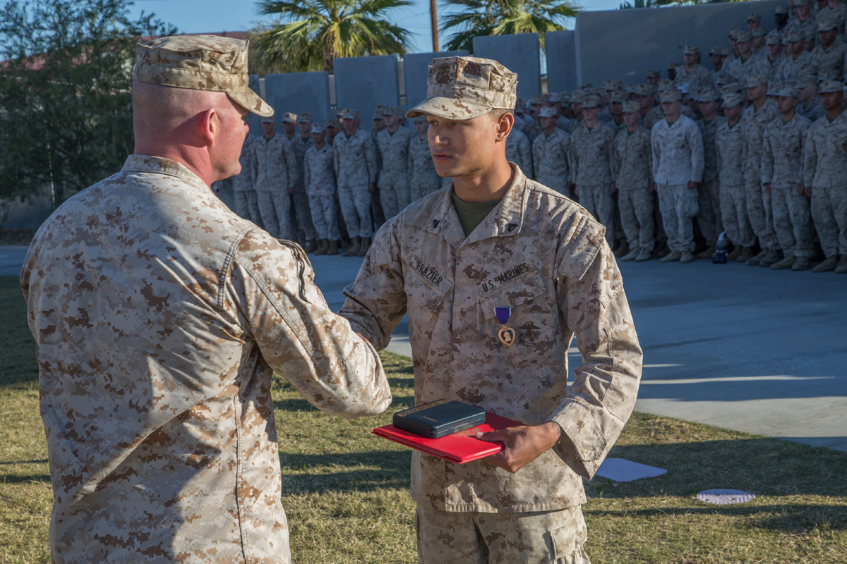 Cpl. Tyler A. Frazier, a mortar Marine with 3rd Battalion, 7th Marine Regiment, is awarded the Purple Heart Medal by Lt. Col. Steven M. Ford, commanding officer, 3/7 at Victory Field aboard the Marine Corps Air Ground Combat Center, Twentynine Palms, Calif., November 7, 2018.
