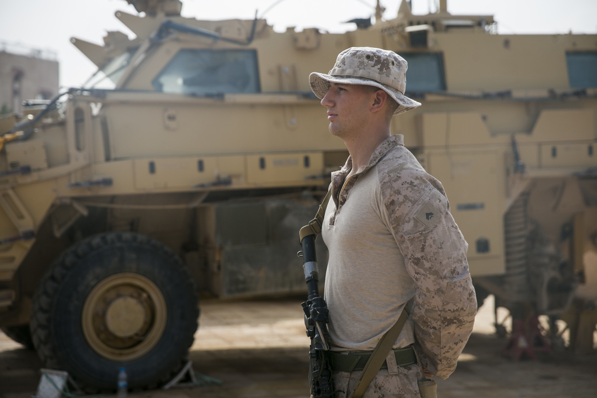 U.S. Marine Corps Cpl. Brendon Hendrickson, an anti-tank missile Marine with 3rd Battalion, 4th Marine Regiment attached to Special Purpose Marine Air-Ground Task Force, Crisis Response-Central Command, stands by during a Purple Heart ceremony, October 22, 2018.