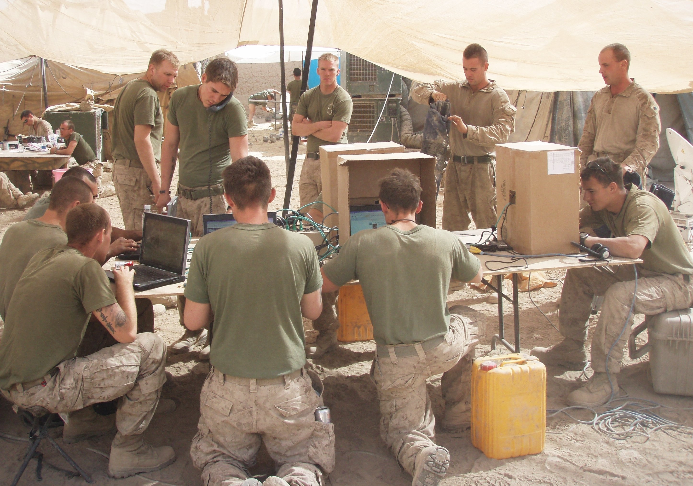 Marines communicate with family and friends on new morale internet lines in 2011 in Kabul, Afghanistan.