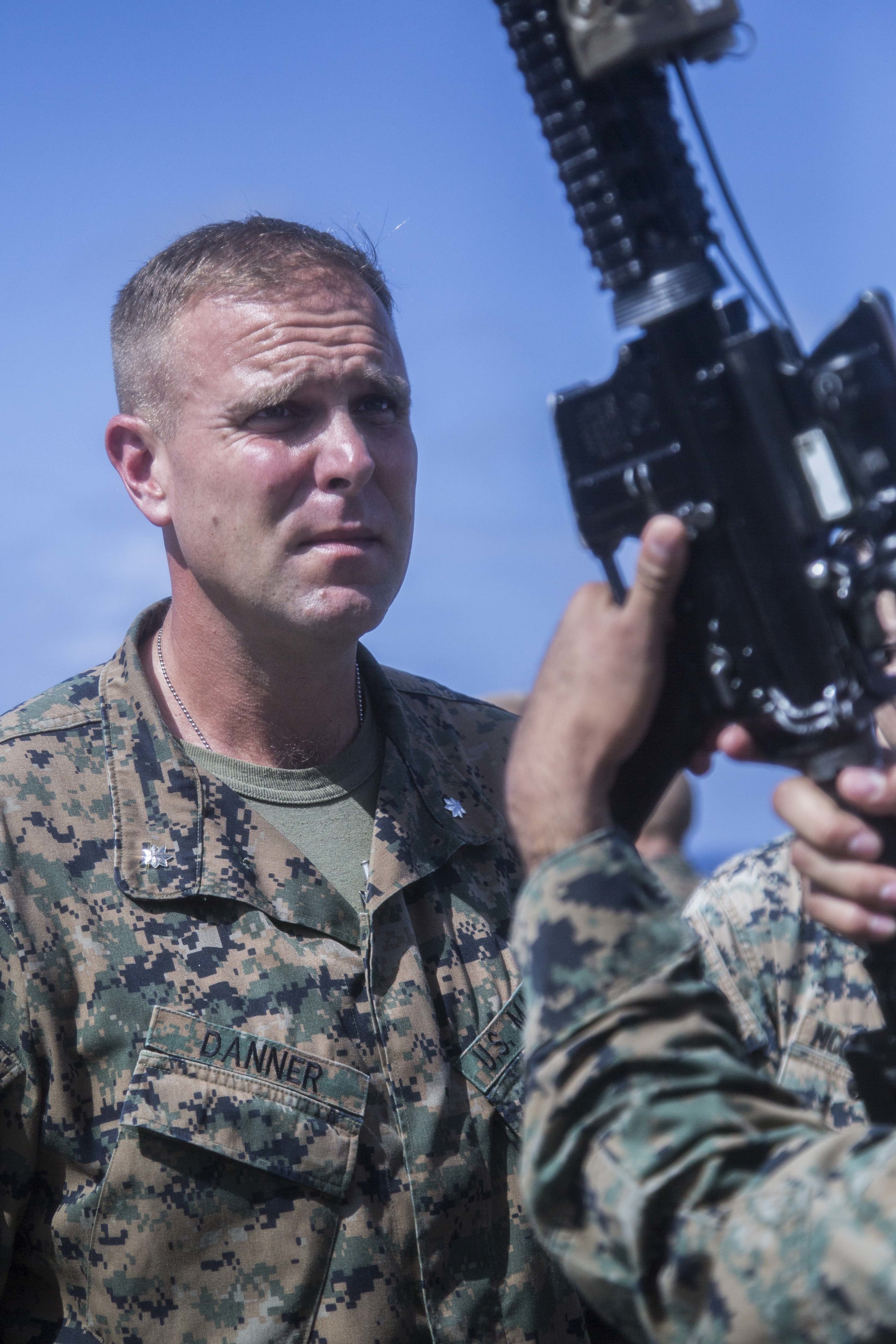Lt. Col. Matthew Danner, battalion commander of Battalion Landing Team 3/1, 13th Marine Expeditionary Unit, inspects a rifle aboard the Wasp-class amphibious assault ship USS Essex during a regularly scheduled deployment of Essex Amphibious Ready Group and the 13th MEU, July 31, 2018.