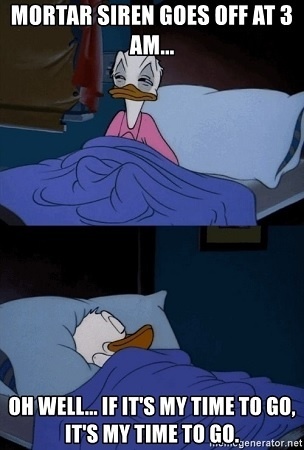 This person really doesn’t want to go to bunker — but the rule-follower is looking, so they have to. They’ve been in-country for a while and they know that things are going to be okay… Probably. The only thing that’s going through their mind is a weighing of options. They’ll be busy thinking about if they want to risk an asschewing, the odds of that mortar hitting where they’re at, and if they want to pretend they “didn’t hear” the siren go off.