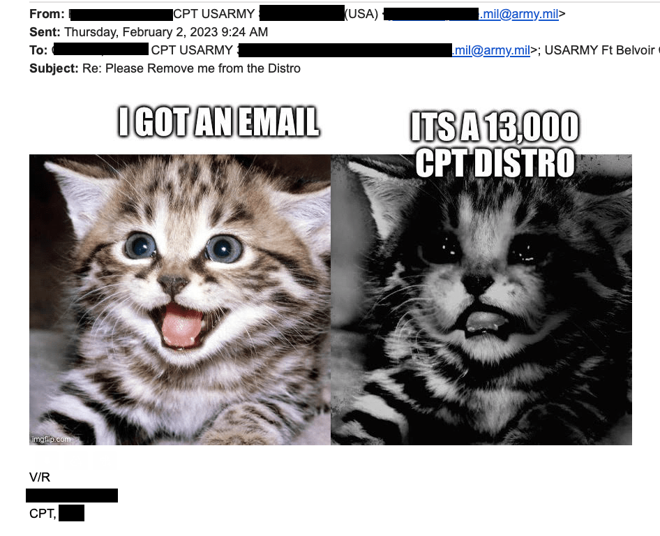 Many soldiers have responded to the email chain asking to be removed, making it worse. Others have made jokes regarding the iconic DoD Cyber Awareness Challenge. However, there have been helpful soldiers who have chimed in to provide instructions on how to remove yourself from the distribution list and compartmentalize your inbox to prevent having to sift through FA57 emails. Of course, the highlights of the email thread are the creative responses like memes and poems.