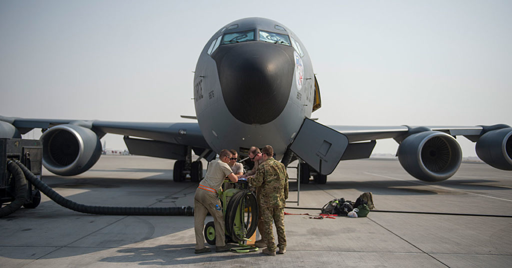 Crew members from the 340th Expeditionary Air Refueling Squadron prepare to take off in a KC-135 Stratotanker before performing a refueling mission over Iraq in support of Operation Inherent Resolve September 15, 2016. The KC-135 provides the core aerial refueling capability for the U.S. Air Force and has excelled in this role for more than 50 years — and could be on the flightline for another 40 years. (U.S. Air Force photo by Staff Sgt. Douglas Ellis/Released)
