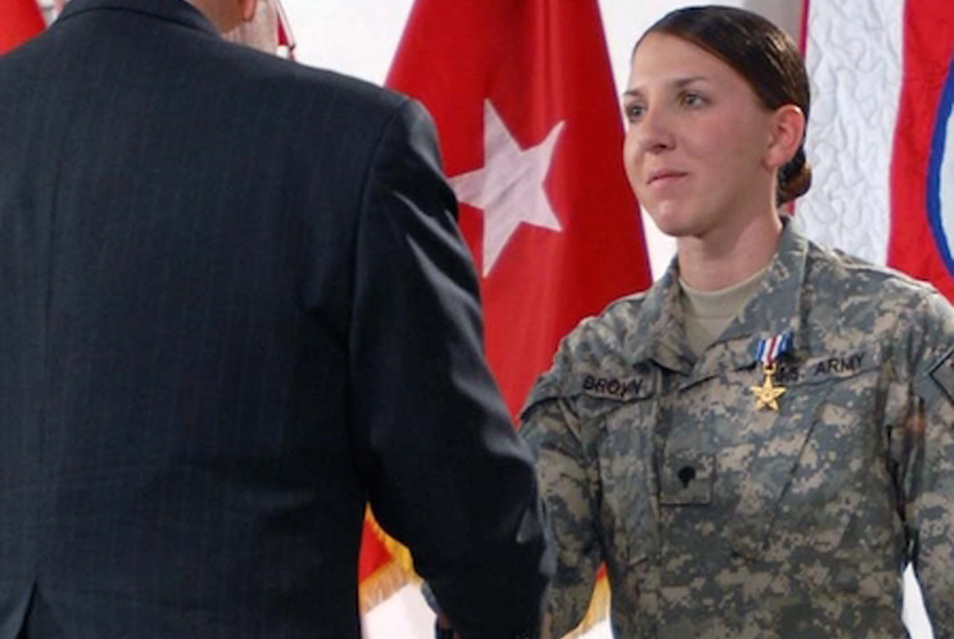 Brown’s platoon sergeant arrived, amazed to see Brown still alive. Seeing the danger from the engulfed HUMVEE and continuing enemy fire, he loaded Brown and the wounded onto an Afghan Army truck and moved them to a safer location. An enemy mortar shell impacted on Brown’s former position just seconds later. All the while, Brown treated the wounded soldiers, continually shielding them from falling brass and enemy fire until the MEDEVACs arrived. Brown’s actions earned her the Silver Star. They also resulted in her being removed from her assignment because of the ban on females in combat.