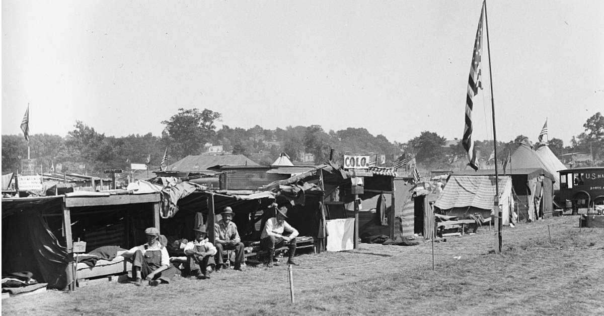 In 1932, over 15,000 veterans and their family members who were camped out near Washington D.C. were forcefully evicted by the Army from the capital grounds and saw their camps burned and children attacked by orders from President Herbert Hoover and Gen. Douglas MacArthur.