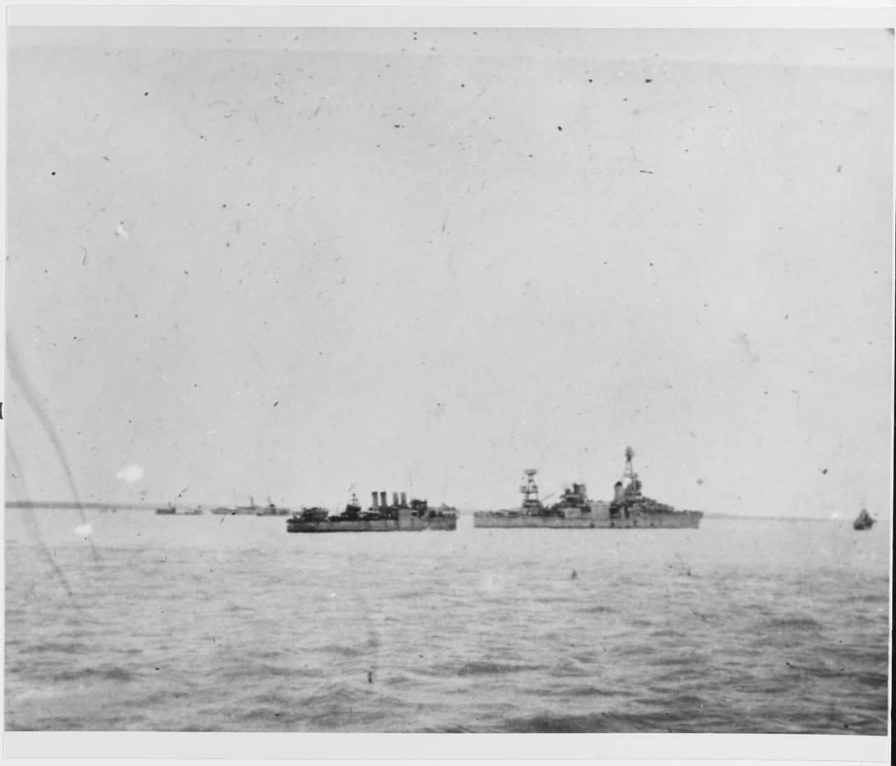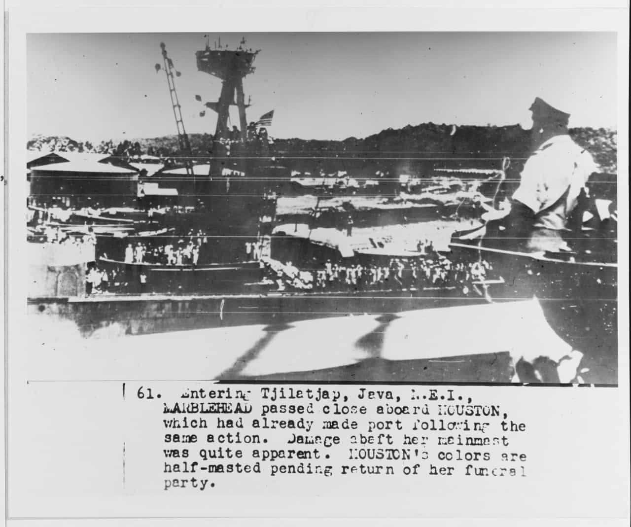 At Tjilatjap, Java, Feb. 6, 1942, seen from USS Marblehead (CL-12), which was passing close aboard. Houston’s colors are half-masted pending return of her funeral party, ashore for burial of men lost when a bomb hit near her after eight-inch gun turret two days earlier during a Japanese air attack in Banka Strait. (US Navy photo)