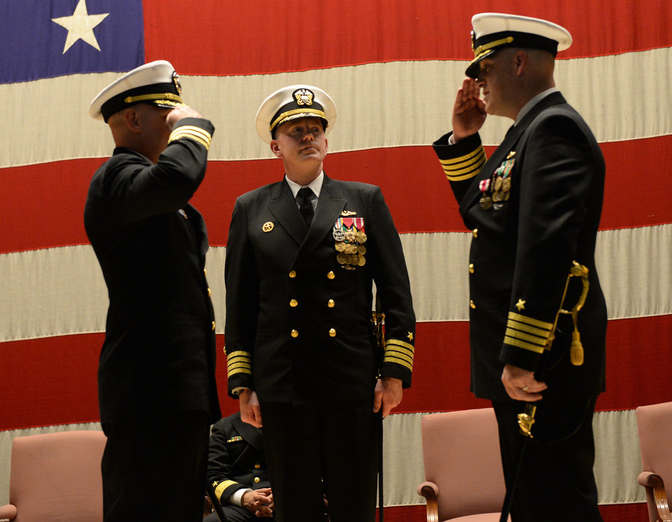 Capt. Ronald Withrow, outgoing commanding officer of the South Dakota, right, returns a salute from his relief, Missouri native Cmdr. Craig Litty, left.