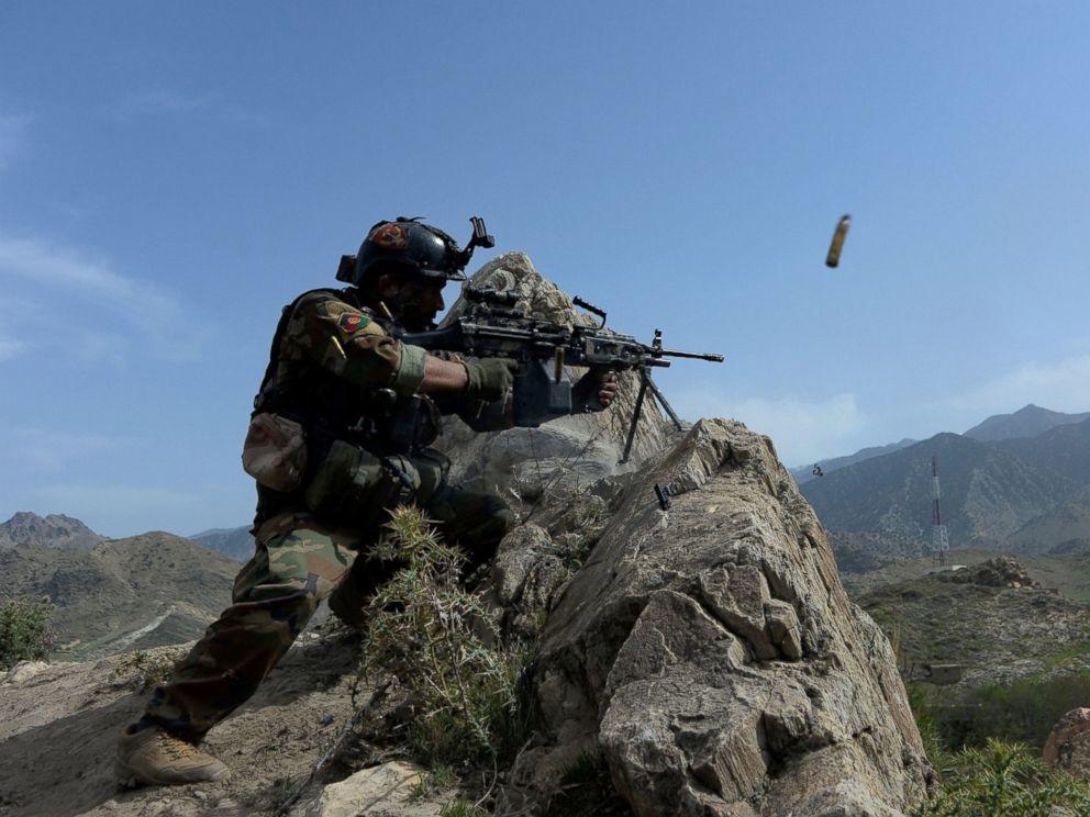 An Afghan security force personnel fires during an ongoing an operation against Islamic State.