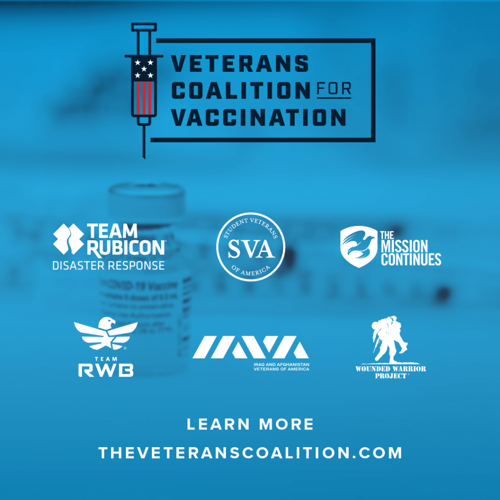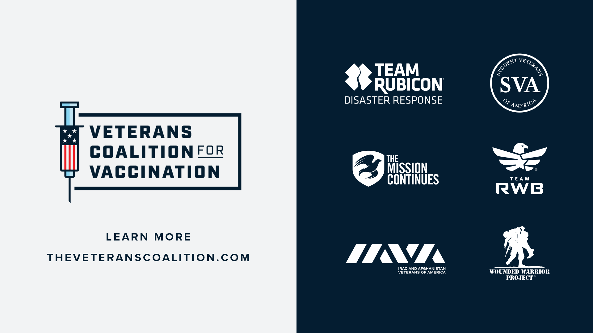 The Veterans Coalition for Vaccination (VCV) includes Team Rubicon, Iraq and Afghanistan Veterans of America, Student Veterans of America, Team Red, White & Blue, The Mission Continues and Wounded Warrior Project. All are united in the commitment to aid local and state officials in distributing the COVID-19 vaccine to American citizens across the country.