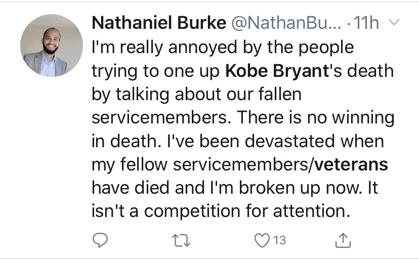 Only a few hours after the tragic news broke of famed basketball player Kobe Bryant’s helicopter crashing, killing all nine passengers (including Bryant’s 13-year-old daughter, Gianna), the social media debates started: Why are we so sad about a celebrity dying but when our service members are killed in the line of duty seemingly no one notices?