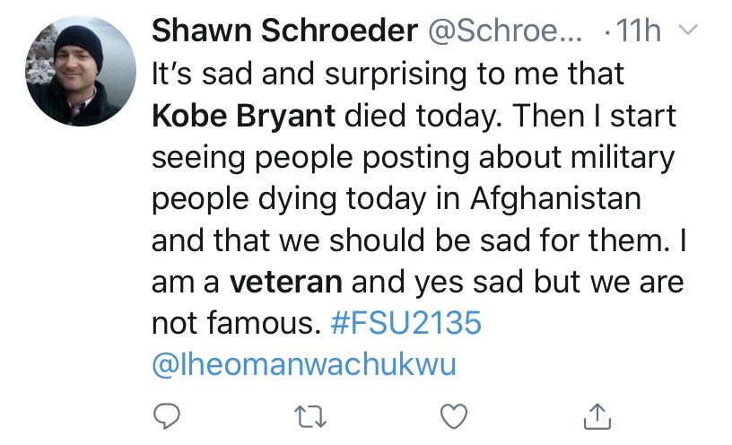 We’re all allowed to feel empathy at a wife losing her husband and daughter and three girls losing their dad and sister, not to mention the other families on board. You’re allowed to grieve someone who inspired thousands and thousands of kids and adults alike to pursue their dreams. At the same exact time, as Americans, we all should know the names of our service members dying for us every day.