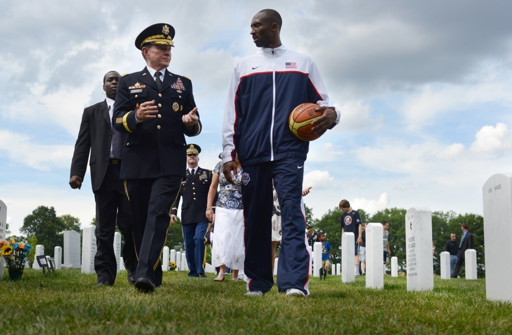 Chairman of the Joint Chiefs of Staff U.S. Army Gen. Martin E. Dempsey, left, and Kobe Bryant talk at Arlington National Cemetery in Virginia, July 15, 2012. (Department of Defense photo by D. Myles Cullen)
