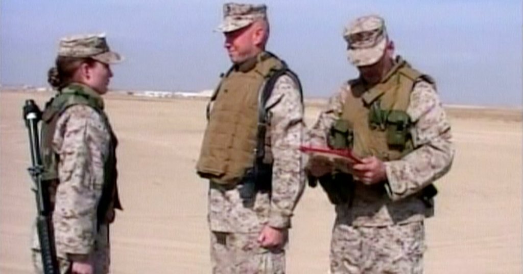 Marine Sgt. Lindsey Vedsted of Sterling, Colorado got her stripes in 2005 in what appears to be boring stretch of desert, but is actually an active minefield near Bagram Air Force Base, Afghanistan.