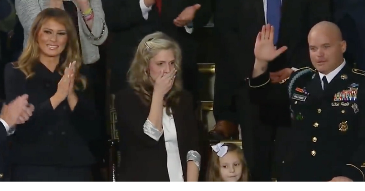 President Trump remarked, “War places a heavy burden on our Nation’s extraordinary military families, especially spouses like Amy Williams from Fort Bragg, North Carolina, and her two children: 6-year-old Elliana and 3-year-old Rowan.” Amy, seated next to First Lady Melania Trump, stood up with her kids to be recognized as President Trump continued.