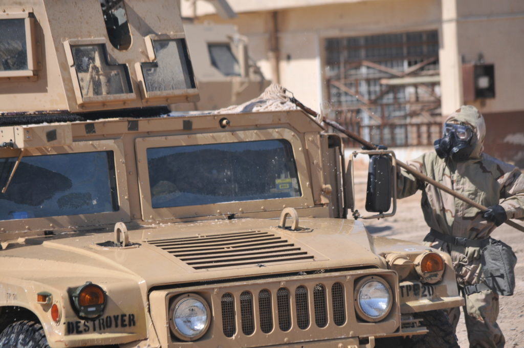 A U.S. Soldier with the 76th Army Reserve Operational Response Command decontaminates a vehicle after a simulated chemical weapons attack during a base defense drill in Camp Taji, Iraq, July 23, 2016. This drill is one way Coalition forces maintain readiness and practice security procedures. Camp Taji is one of four Combined Joint Task Force – Operation Inherent Resolve build partner capacity locations dedicated to training Iraqi security forces. (U.S. Army photo by 1st Lt. Daniel Johnson/Released)