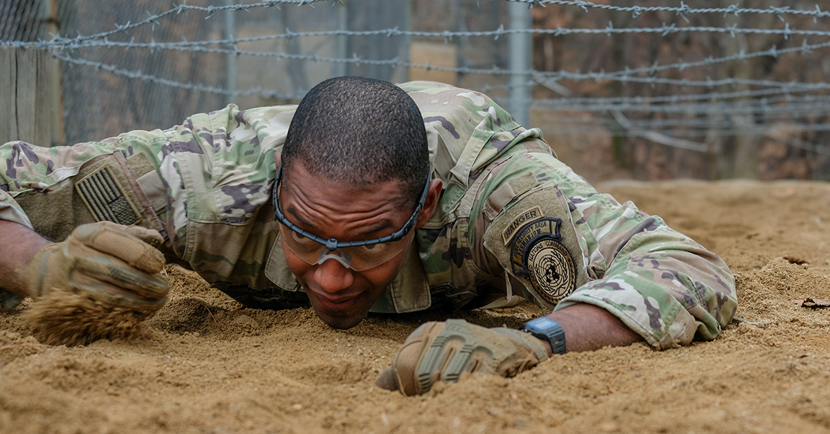 An Army captain crawls through the dirt, sleeves rolled like he’s ready to adorn a movie poster.