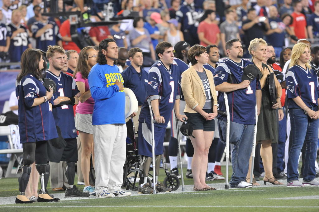 Chris Claude is a 33-year-old Marine Corps veteran from Pennsylvania. He met with marathon amputees and told the Associated Press it was his chance to provide the kind of support he got after the amputation of his right leg following a 2005 bomb blast in Iraq. B.J. Ganem, a Marine who lost his left leg in Afghanistan, said all he saw was resilience. The two groups came together again later in 2013, at the New England Patriots home opener. They were honored on the field together before the game.