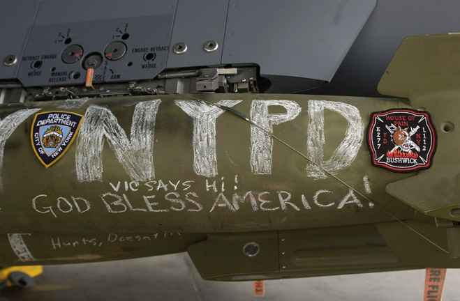 Writing messages on bombs, missiles, and other munitions is a common and long-standing tradition. After the 9/11 Attacks, messages of solidarity for New York and vengeance against al Qaeda and the Taliban started popping up on bombs headed for Afghanistan. Hussein and the Ba’ath party were favorite targets for graffiti over Iraq in the early 2000s.