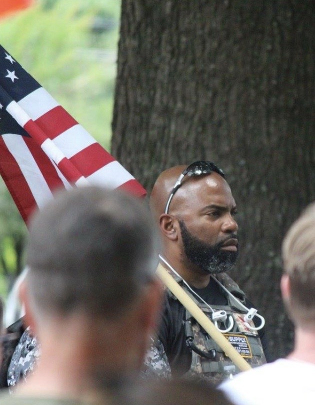 A man with a bald head and a full beard, wearing a dark suit jacket over a white dress shirt, stands in front of a backdrop featuring a partial American flag and large black text. A microphone is positioned in front of him.