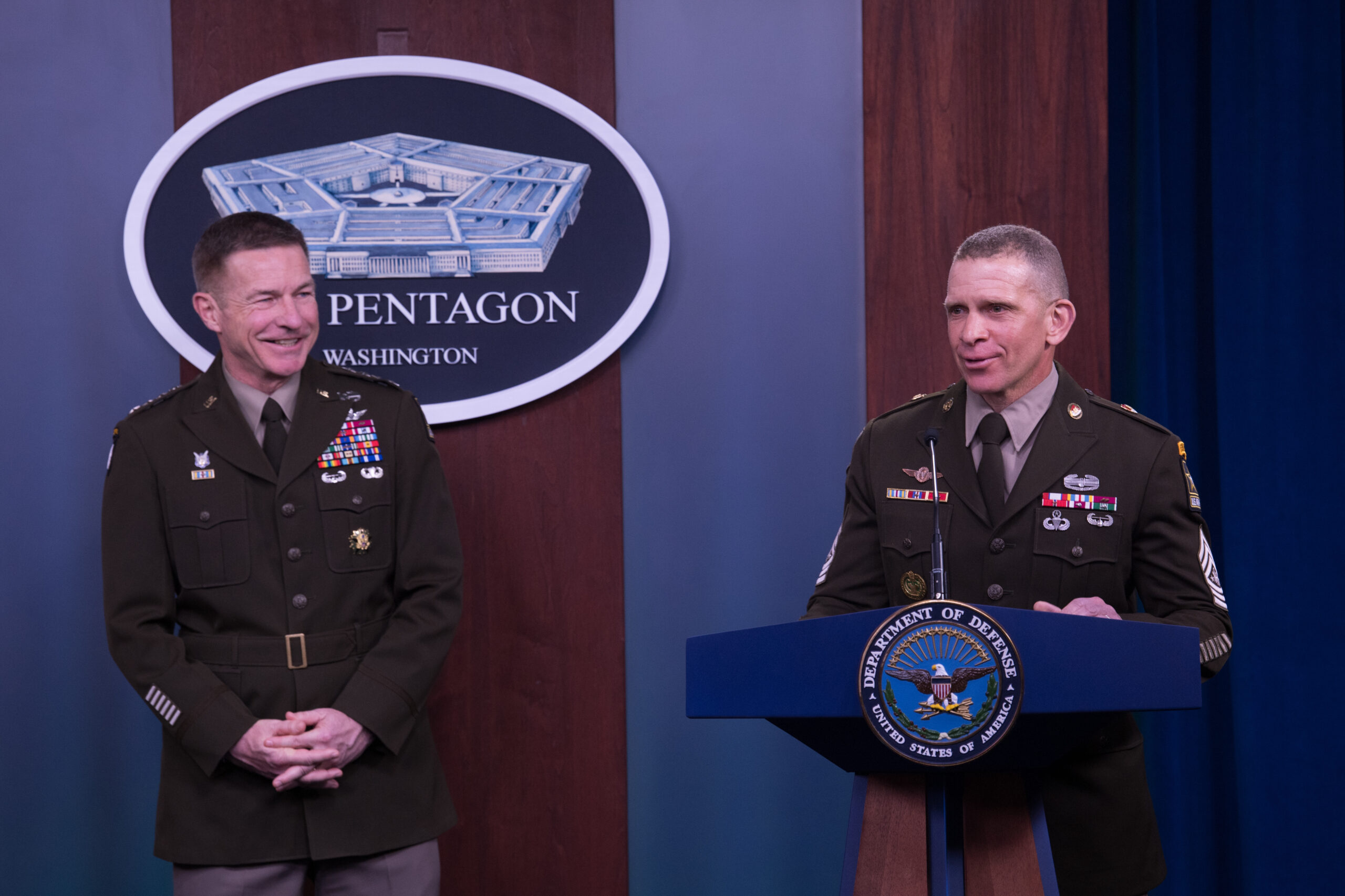 Two military officers in formal uniforms are at a Pentagon press briefing. One officer stands behind a podium with a Department of Defense emblem, speaking into a microphone, while the other stands nearby smiling. The background features a Pentagon emblem and wood paneling.