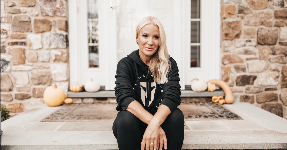 A blonde woman with long hair sits on stone steps in front of a white door framed by a stone wall. She is wearing a black hoodie with a gold emblem and black pants. Around her on the steps are various pumpkins and gourds, suggesting an autumn or Halloween setting.