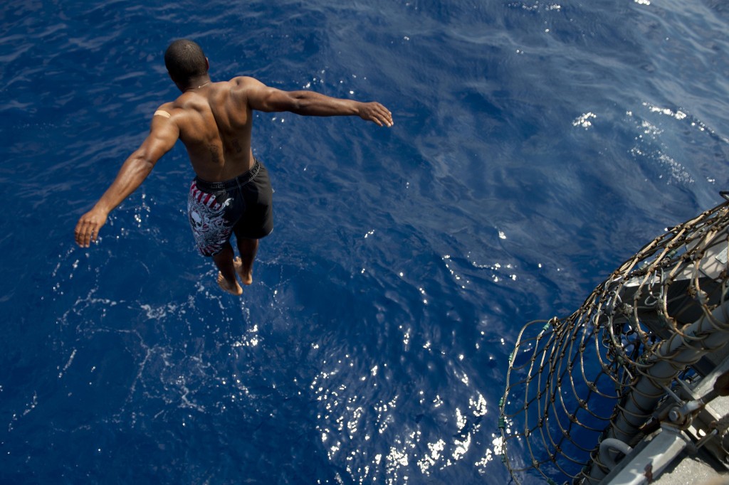 If you accidentally fall off a ship, you won’t get in trouble. But if you take a plunge intentionally, there can be some consequences. If you plan on taking a dip, make sure your commander says it’s ok first.