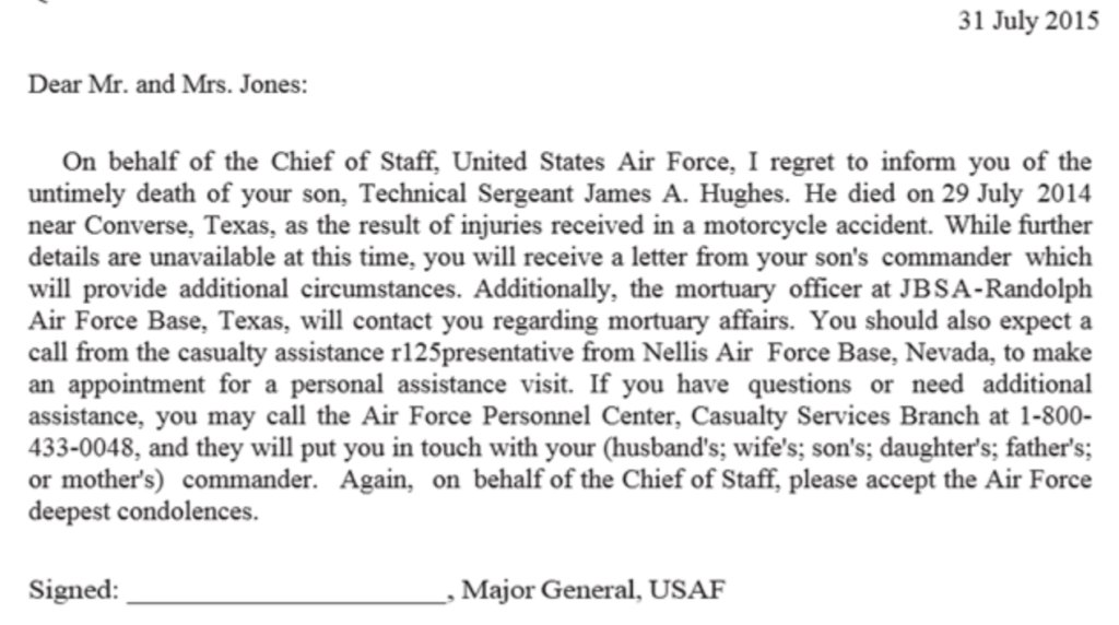 In military speak, the purpose of this program is to provide “prompt and accurate reporting, dignified and humane notification, and efficient, thorough, and compassionate assistance to the next of kin and/or those designated to receive benefits/entitlements.”