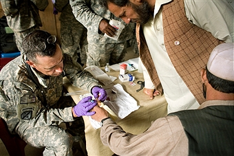 In hopes of gaining the locals’ trust, the medical staff typically don’t wear their protective body armor or carry their side arms to the events.