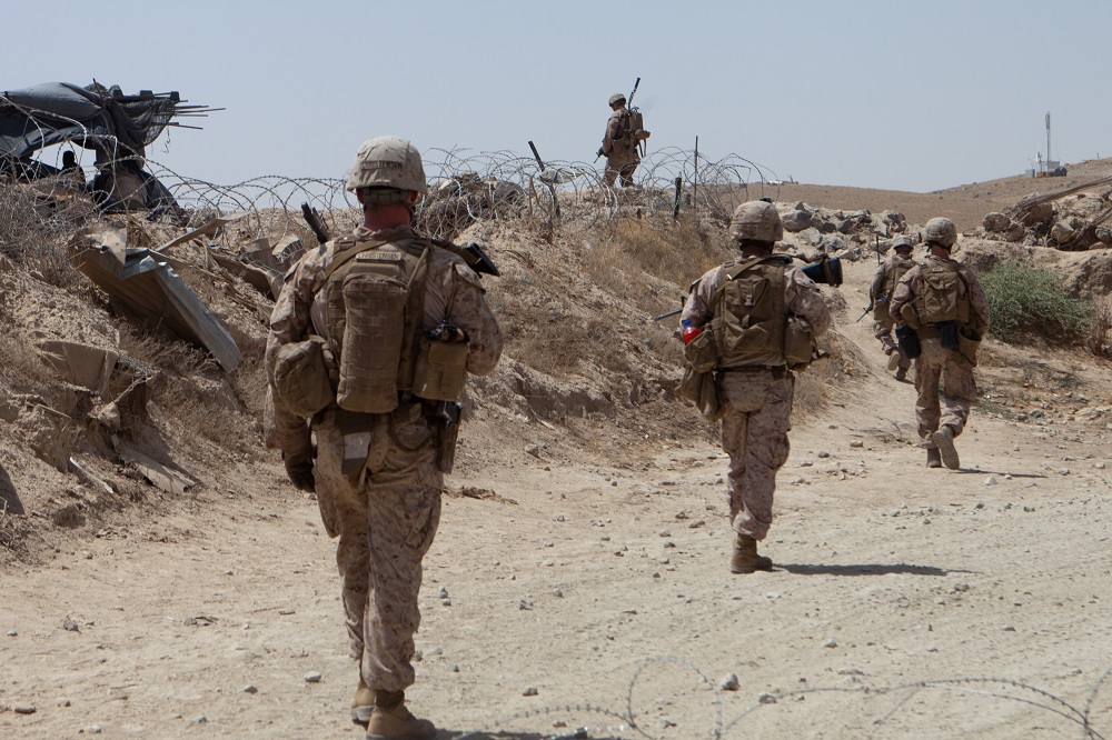 Marines depart their entry control point on a foot patrol heading toward the bazaar in Now Zad district, Helmand province, Afghanistan. (Source: USMC Life)