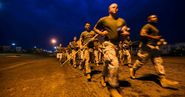 These Marine Corps officer candidates coping with the cold while carrying close to their equivalent in weight: