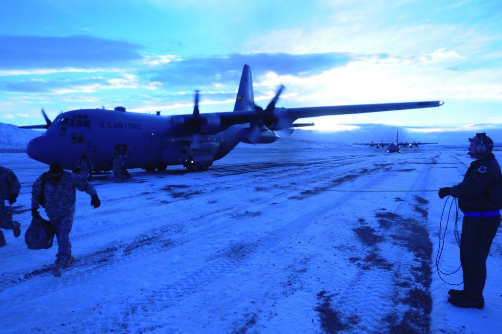 This picture of Air Force C-130s landing on an icy runway to deliver troops: