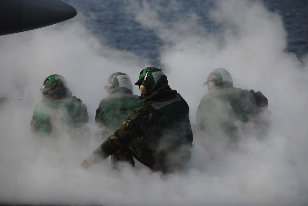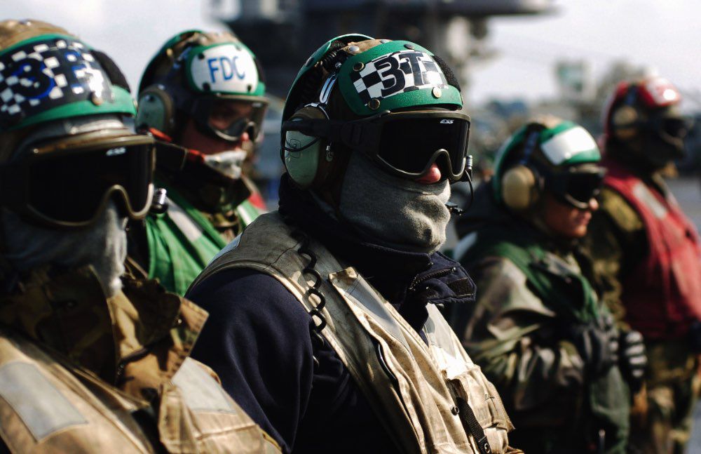 This sailor directing an E/F-18 Growler in the middle of a heavy snow storm: