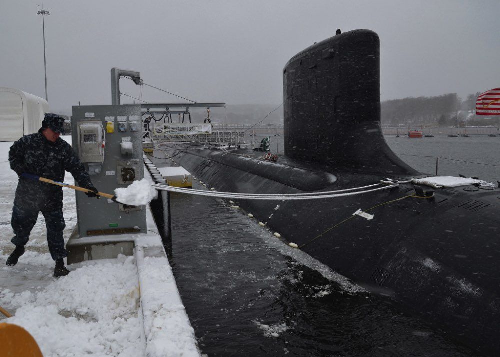 This sailor clearing the snow from the pier to make it easier to get in and out of his home — the USS Missouri: