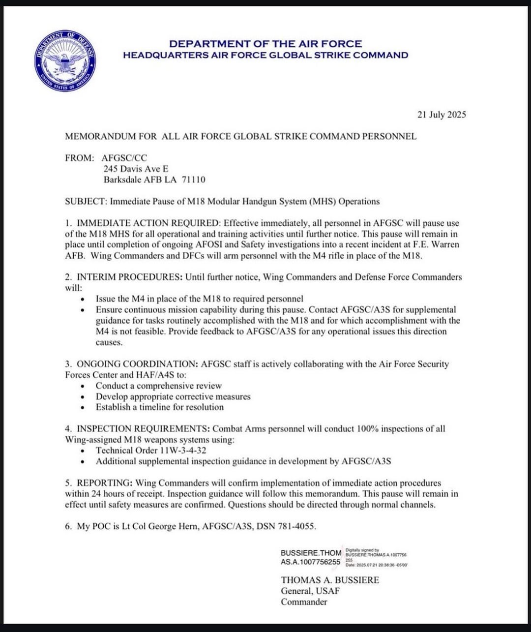 The commander of Air Force Global Strike Command, Gen. Thomas A. Bussiere, has ordered the immediate pause of Sig Sauer’s M18 pistol operations across the Air Force major command. A memo issued July 21, 2025, also orders that the M4 carbine be issued in place of the M18.