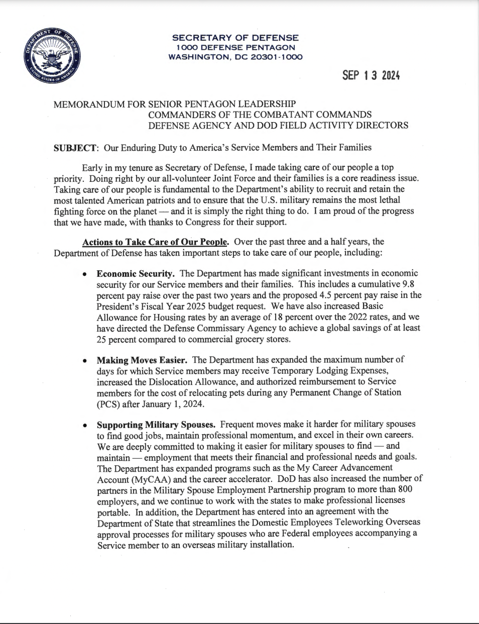 On September 13, 2024, Secretary of Defense Lloyd J. Austin III announced the latest set of initiatives – which are part of his ongoing “Taking Care of Our People” priority – aimed at improving the well-being of military members and their families.