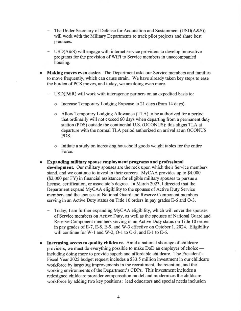 Previous initiatives under Austin’s commitment to military families have included increases in housing allowances to more appropriately match duty stations, fully funding DoD commissaries, a permanent increase to standard temporary lodging expenses (TLE), extra support for EFMP families, an amendment to SCRA that requires that professional licenses be portable (except law) for service members and their spouses, and implementation of universal pre-kindergarten at Department of Defense Education Activity schools.