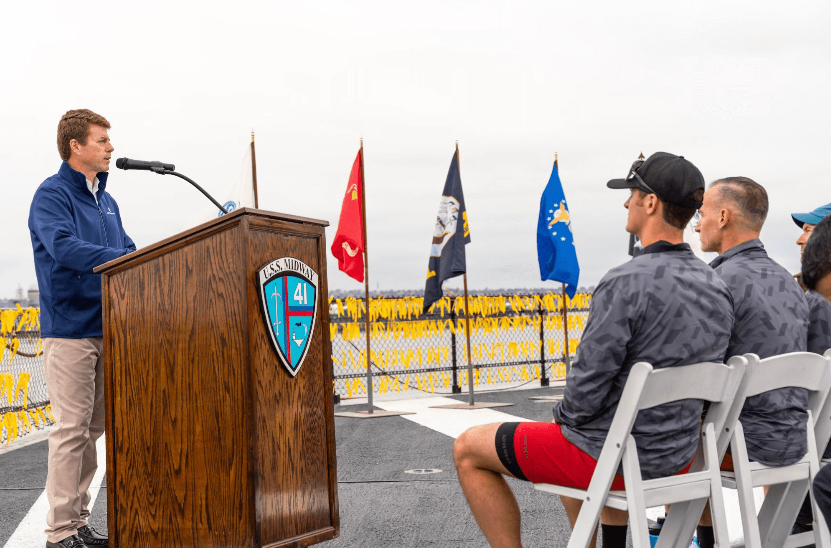 The send-off ceremony at the USS Midway Museum included remarks by Team RWB staff and corporate sponsors, including Lee Wright, CEO of The Vitamin Shoppe.