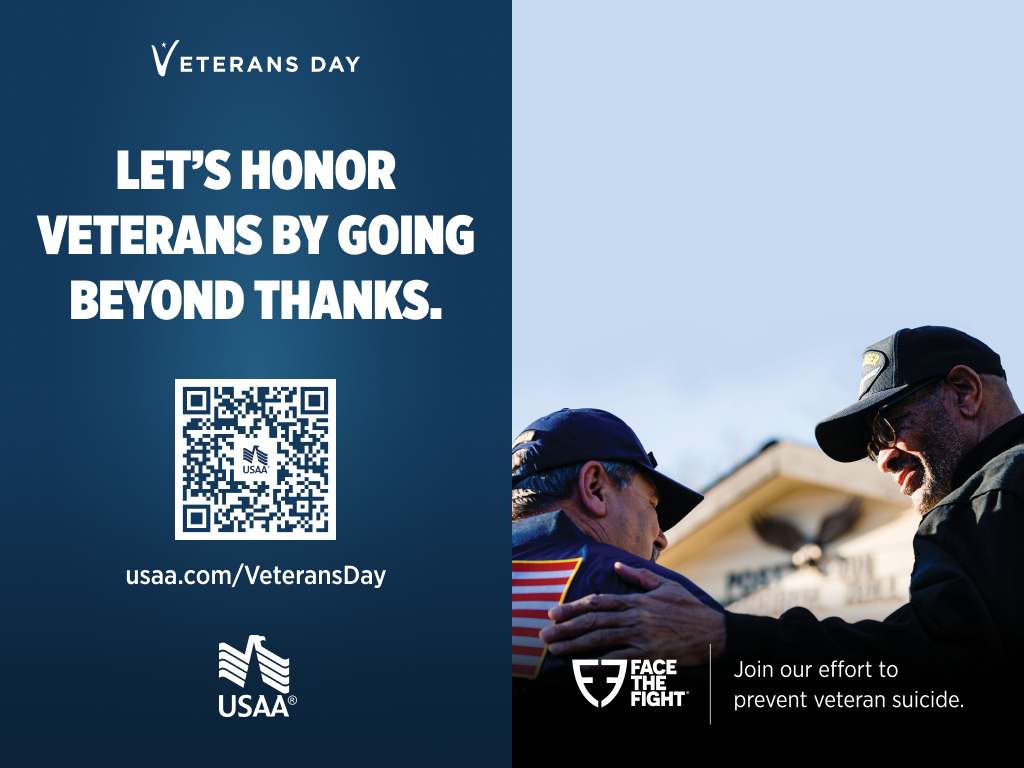 Americans can go beyond Nov. 11 to show their appreciation of our veterans and make an impact through events, volunteering and donating to causes like Face the Fight®, a veteran suicide prevention initiative founded by USAA, Reach Resilience, and the Humana Foundation. In coordination with Veterans Day, USAA will match donations up to $1 million through Nov. 30. Money donated to the Face the Fight charitable fund will be granted by USAA to nonprofit organizations that support initiatives focused on preventing veteran suicide and breaking the stigma around seeking help. With a veteran suicide rate that exceeds that of the general public, Face the Fight, with its coalition of more than 200 organizations, is working to bring scalable resources and programs to our veterans facing challenges.