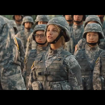 Shitty job rolling those BDU sleeves, but at least she tried to crease them. Nails probably not reg, but the only person who would really care is Kanye West.
