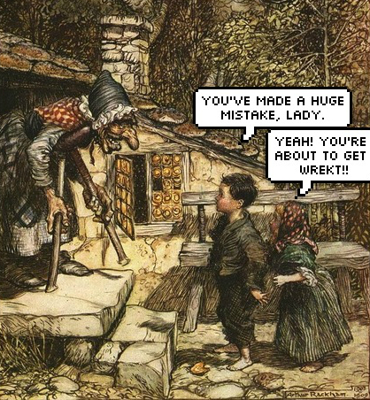 Near the house, the kids prepared a number of traps normally used to hunt game for food. These traps were positioned on areas the stepmother was known to frequent and the kids waited. When she trapped herself in a snare near the river, the kids bundled her up and sent her to a black site hidden under a candy cottage. The HUMINT guys got valuable information about witch operations and everyone else lived happily ever after.